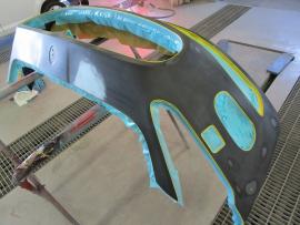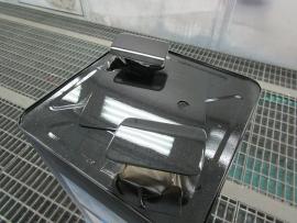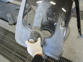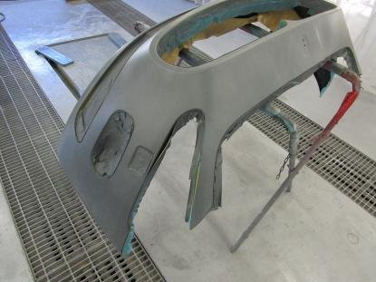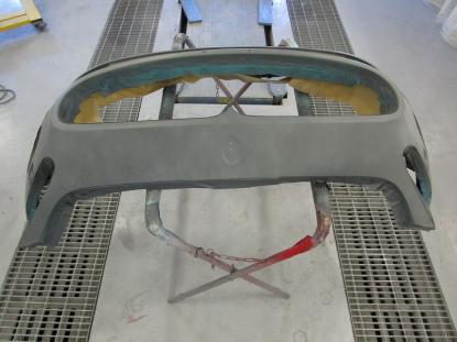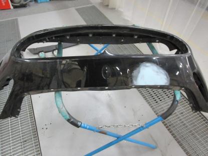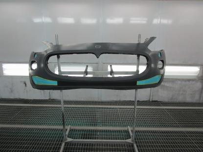 水研ぎで下地を仕上げてから塗装ブースの中で、フロントバンパーを専用の台にセットしたら塗装前の準備が完了です。 |