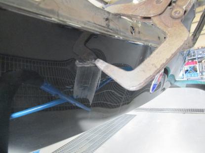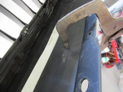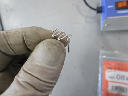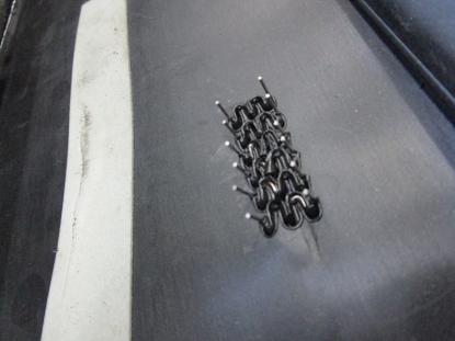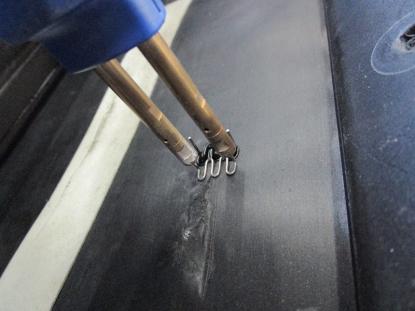 バンパーの裏面を溶かしながらピンで留めていきます。 |