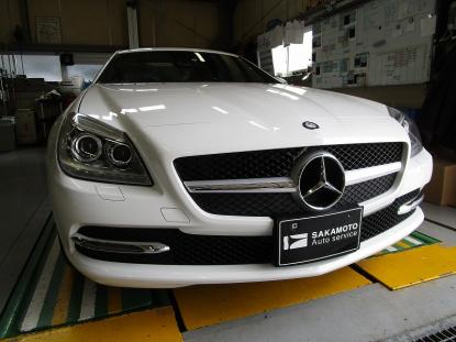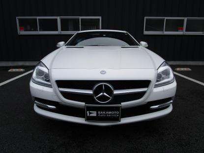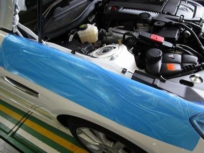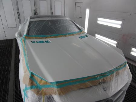 調色作業を行ったあと、ゴミやほこりがシャットアウトされた塗装ブースの中にメルセデスベンツSLK200(R172型)を入れ、マスキングをしたら塗装前の準備が完了です。 |