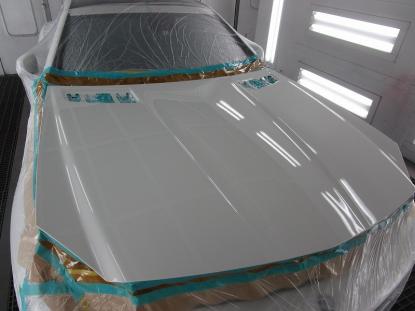 赤外線乾燥機で強制乾燥後、始めに320番のペーパーで空研ぎを行います。その後、800番のペーパーで水研ぎを行ってボンネット全面の下地を仕上げていきます。 |