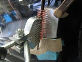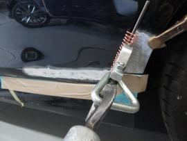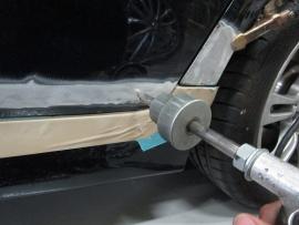 ダメージを受けた部分の塗装を削り、ワッシャーを溶接して少しずつ元の高さまで引き出します。凹んでいる部分を引き出しながら、まわりをハンマーでならしていきます。 |