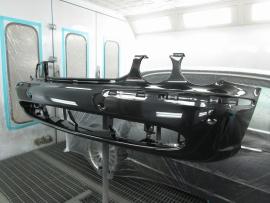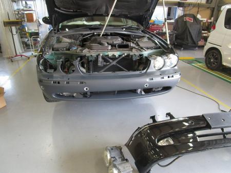 幸い内板骨格にダメージがありませんでしたので、新品のフロントバンパーを仮組みして板金作業が完了です。 |
