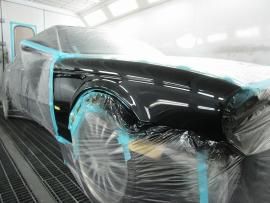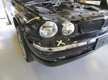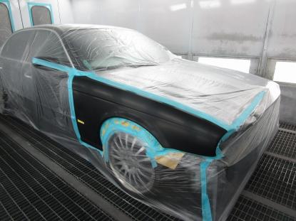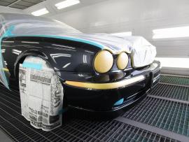 イタリア製の高級塗装ブースの中でジャガーXJ(X350系)のマスキング作業を行います。 |