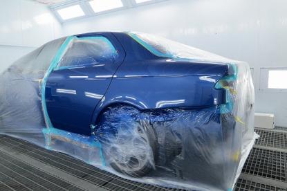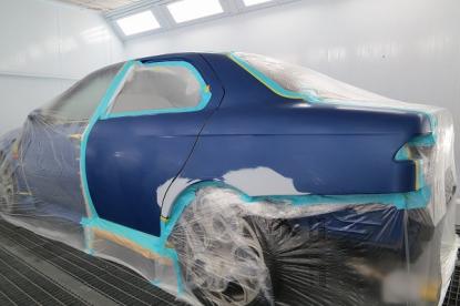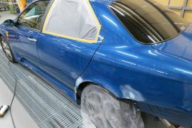 水磨ぎ後、マスキングの作業が終わり塗装の前の準備作業が完了です。毎日、異なる気温や湿度を考え、最適なシンナーを選択し156GTAのオリジナルの塗装肌を忠実に再現していきます。 |