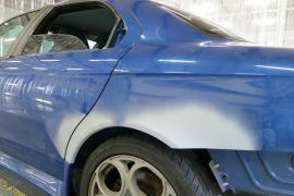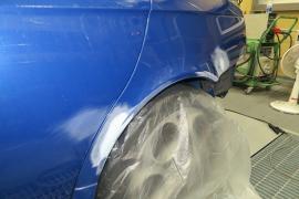 左リヤドアとクオーターはわずかなヘコミがあったのでワッシャー溶接で引出し、その後、薄くパテをつけて平らになるように削り、サフェーサーを吹き付けます。もちろんサフェーサーを削る際は必ずガイドコートで確認しながら薄いペーパーの目や巣穴と呼ばれるパテの細かい穴に注意しながら水磨ぎ作業します。 |