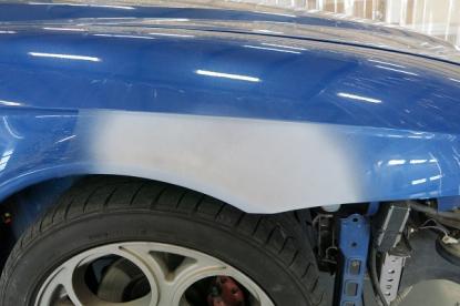 右フロントフェンダの損傷は、へこみはなくキズだけでしたのでダブルアクションサンダーで削り取り、脱脂後サフェーサーを吹き付けます。 |