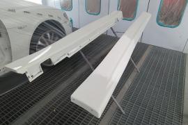 WALD製のサイドステップと純正のサイドステップを修理しているところです。WALD製のエアロパーツはFRPで出来ていますので、割れた部分を削り取り、ガラス繊維を裏と表から貼って修復します。そして最後にパテで成型して修理完了です。その後サフェーサーを塗装します |