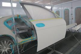 塗装ブースの中で、BMWの外板パネルと樹脂製のサイドステップ・FRP製のサイドステップを塗装しました。塗り終わったら60℃×1時間の加熱乾燥を行います。しかし、ここでFRP製のサイドステップだけは別に乾燥させます。なぜならFRP製は熱をかけるすぎると気泡のようなブツブツが出てきてしまう場合があるので、慎重に温度管理しなくてはならないからです。 |