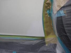 傷をダブルアクションサンダーで削り取り、カラーサフェーサーを塗装して表面をシールします。その後、強制乾燥させてサフェーサーが硬化したら、耐水ペーパーを使って平らに研ぎ作業をおこなってからマスキング作業に入ります。 |