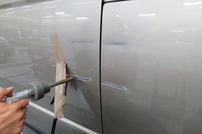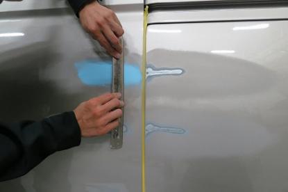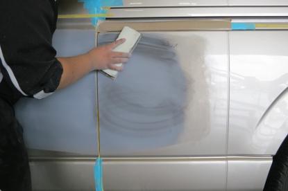 ここでは、小さなヘラで付けたパテをパテワイパーと呼ばれる長い定規のようなもの使って平らになるように付けていきます。坂本オート・サービスでは、さまざまな道具を使いこなしており、ワイパーを使うことによってパテを付け終った時点で、すでにほぼ完璧に平らになるからです。 |