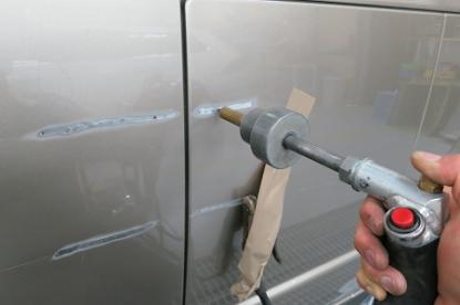 ピンポイントでスタッドを使いワッシャーを溶接します。少しずつ元の高さまで引き出します。 |