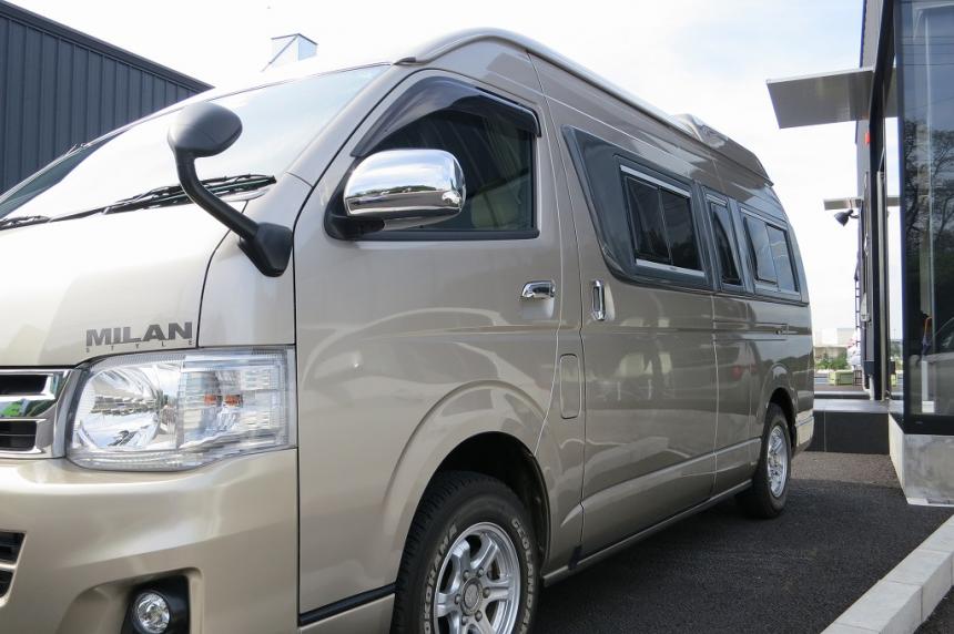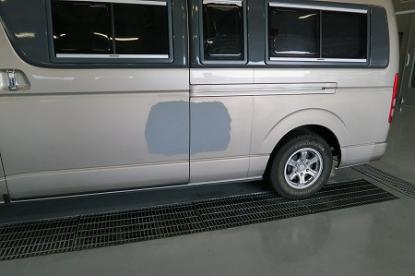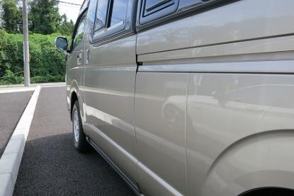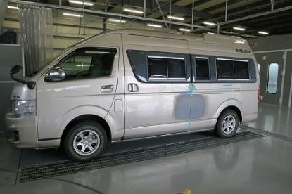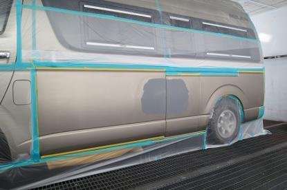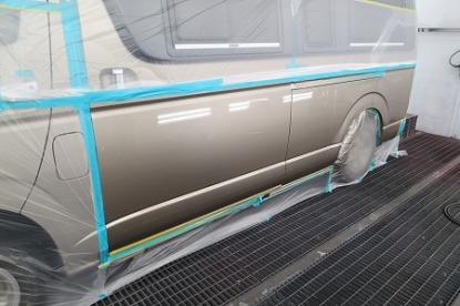 ゴミやほこりをシャットアウトされた塗装ブースの中でRM社の高級水性塗料を使い、その日の気温・湿度を考えてシンナーの選択をして、ハイエースオリジナルの塗装肌を再現していきます。 |
