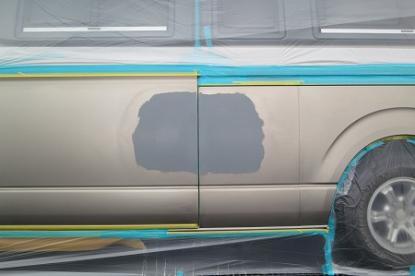 マスキングです。今回は自費での修理ですので、あまり部品を取り外さなくても綺麗に見えるように、少し工夫をしてプレスライン等を使いうまく分からなく塗装作業しました。 |