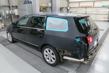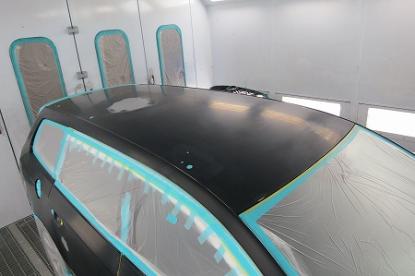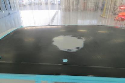 まず、必要な部品を取り外していきます。輸入車の場合、このようにルーフモールを取り外す際にルーフヘッドライニング(天井の内張り)を外さなくては取り外せない構造になっているお車が非常に多いです。また、ルーフを作業する際は、フロントガラスの脱着もなるべく塗装直前まで外さないで作業します。なぜなら、すぐに取り外すと車内にホコリや汚れが付いてしまったりするリスクを最小限にするためです。 |
