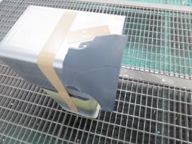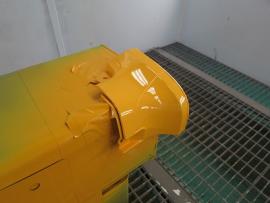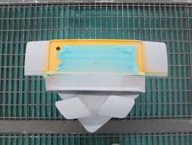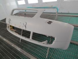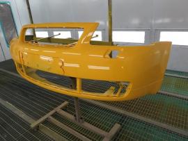 サンディング終了後、ナンバープレートの台と一緒にサフェーサーを塗装します。 短波と呼ばれる赤外線乾燥機で60℃×20分、強制乾燥させた後、800番から1000番の耐水ペーパーで平らになるように水磨ぎを行います。その後、バンパーを専用の台にセットし、車両に取り付けられている状態を再現して塗装をします。 |