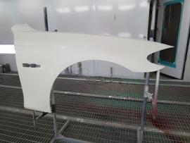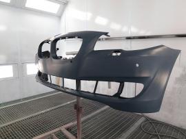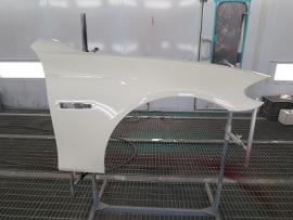 新品パーツを800番から1000番の耐水ペーパーでサンディング後、シリコンオフで脱脂を行います。その後、バンパーを専用の台にセットし、車両に取り付けられている状態を再現して塗装をします。 |
