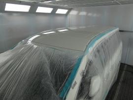 塗装が終わりました。フロントガラスは付いたままですが、接着されている部分はすべて外されており、ただボディにのせている状態(手で取れる)で塗装作業を行っております。 |