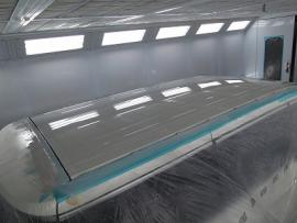 ルーフの傷に2液型サフェーサーを塗装します。 短波と呼ばれる赤外線乾燥機で60℃×20分、強制乾燥させた後、800番から1000番の耐水ペーパーでルーフ全体に水磨ぎを行います。 |