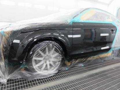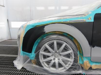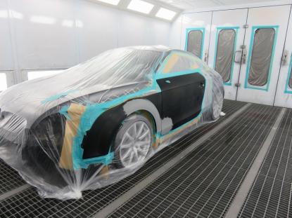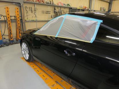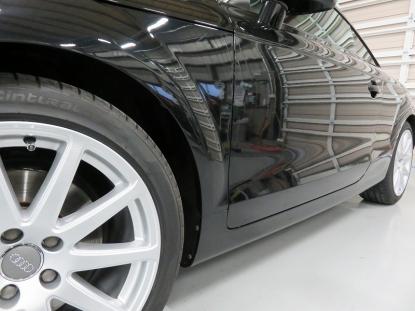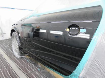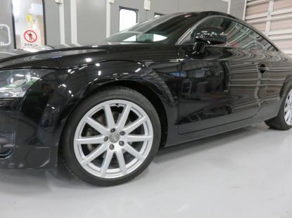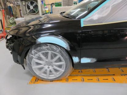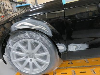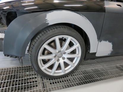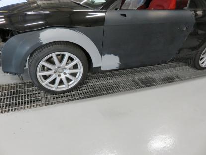 イタリア製の塗装ブースの中でRM社の高級水性塗料を使い、アウディTTのオリジナルの塗装肌を再現していきます。この後、磨き作業やパーツの取り付けを行いボディリペアは完成です。 |