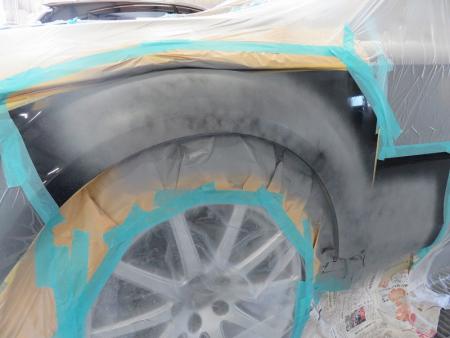サフェーサー塗装の準備をします。細かい巣穴や傷を見逃さないようにする為に、ガイドコートをしてからサンディングをしているところです。 |