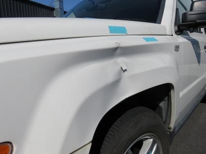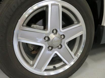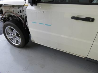 停車中に左フロント部を相手の車に擦られてしまい、傷やへこみが出来てしまった被害車両のお車の修理事例です。左フロントホイールにも損傷が見られたため、4輪アライメント測定も行いました。 |