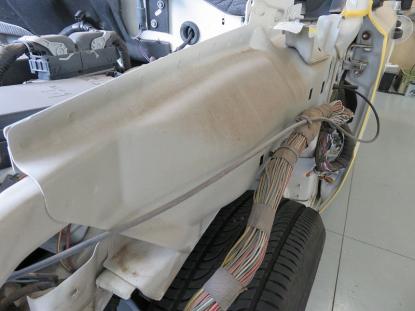 フロントフェンダーを外したところで、内部の損傷を確認します。 |
