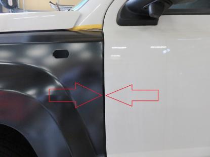 新品パーツをボディに取り付けします。新品とは言え必ず現車にあわせて、赤い矢印をしたところを中心に隙間や高さの調整をしていきます。 |