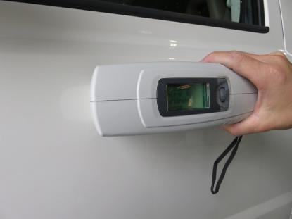続いて塗装作業に移ります。多角型分光測色機(アクワイヤーⅡ)を使って色の配合を調べます。 |