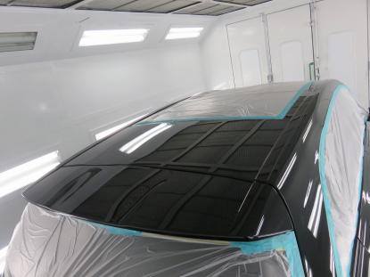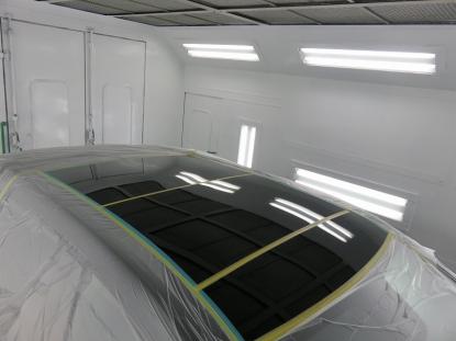 塗装乾燥ブースにメルセデスベンツB250(W246)を入れ、60℃×1時間の加熱乾燥を行います。この強制乾燥によって耐久性の高いコーティング被膜を形成することが出来ます。 |