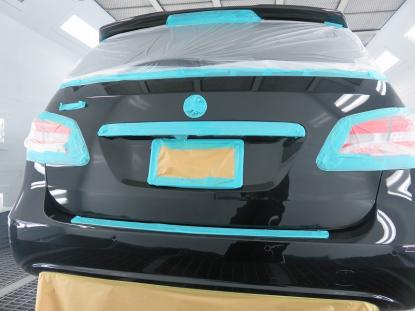 マスキング作業です。毎度のことですが、ドアやフェンダー等の内部(裏側)に、磨いた際に出るコンパウンドのカスがこびり付いたりすることを防ぐためにも、マスキングはとても重要な作業になります。 |