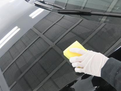 B250のルーフはガラス製ですので、ガラス専用の撥水剤を使用します。ボディとは違いガラス研磨剤から定着安定剤そして撥水剤と三つの工程を経て完成します。 |