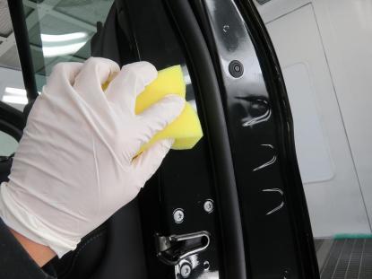 コーティング剤はボディ外側だけでなく、サイドステップやドア等の内側部分のすみずみまで塗りこんでいきます。コーティング剤を塗った塗装の表面が白く濁った状態になるまで時間を置いてから、専用のクロスで拭き上げます。 |