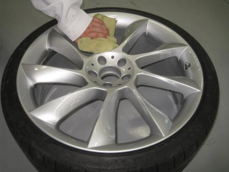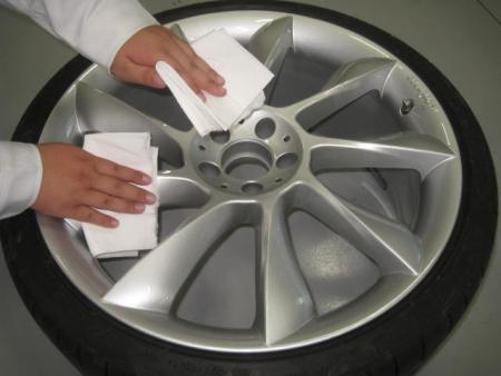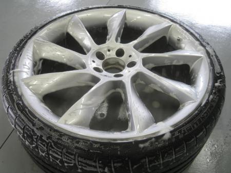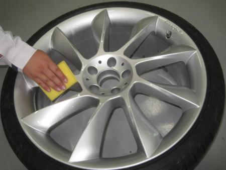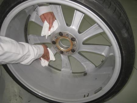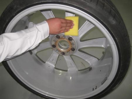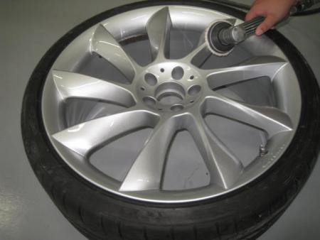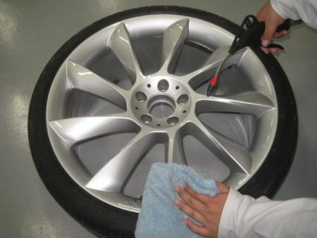 まず車両からホイールをはずし、付着した汚れやブレーキダストを洗剤で水洗いし、表も裏もきっちり掃除します。 |
