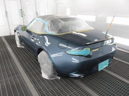 コーティング剤を塗った塗装の表面が白く濁った状態になるまで時間を置いてから、専用のクロスで拭き上げます。そして最後に、耐久性の高いコーティング被膜を形成させる為、塗装乾燥ブースにマツダロードスター(ND系)を入れ、60℃×1時間の加熱乾燥を行います。 |