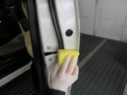 マスキング作業です。ボディの隙間にコンパウンドのカスが入らないように細部まできっちり貼っていきます。 |