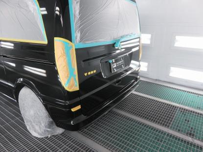 耐久性の高いコーティング被膜を形成させる為、塗装乾燥ブースでメルセデスベンツV350(W639)のボディ全体に60℃×1時間の加熱乾燥を行います。 |