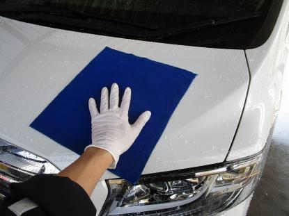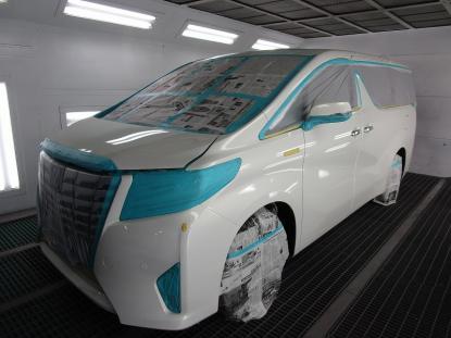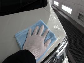 コーティング剤を塗った塗装の表面が白く濁った状態になるまで乾燥させてから、専用のクロスで拭き上げていきます。そして最後に、耐久性の高いコーティング被膜を形成させる為、塗装乾燥ブースにアルファードハイブリッド(30系)を入れ、60℃×1時間の加熱乾燥を行います。