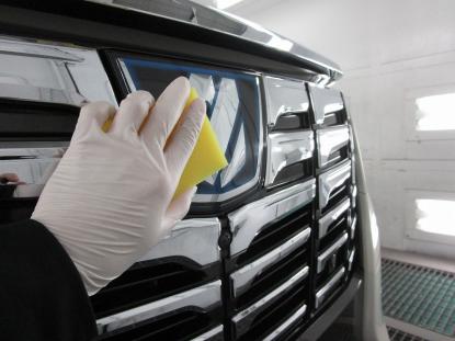 コーティング剤はボディの表面はもちろんですが、グリルやドアの内側部分に至るまで、すみずみまで塗りこんでいきます。