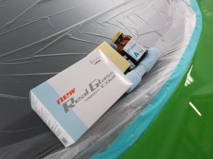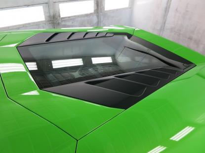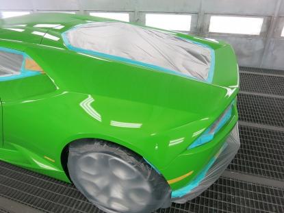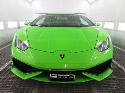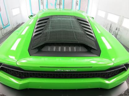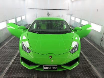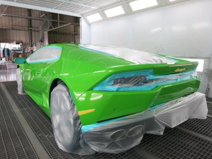 コーティグ剤を拭きあげた後、塗装乾燥ブースにランボルギーニ・ウラカンを入れ、60℃×1時間の加熱乾燥を行います。この熱処理により、コーティング被膜をしっかり硬化させることできます。これも毎度のことだと思いますが、塗装乾燥ブースを持つ鈑金塗装工場でボディコーティグを施工する最大のメリットであると思います。 |