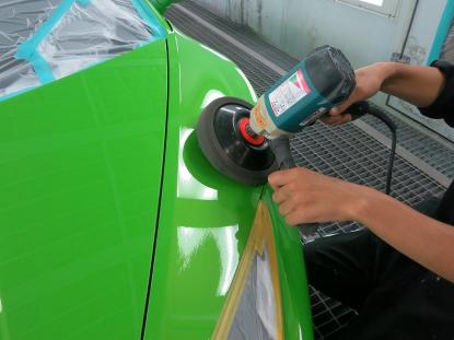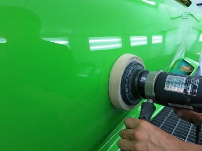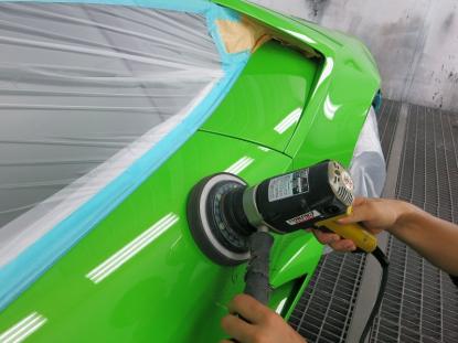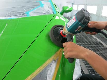 磨き作業の工程です。シングルポリッシャーにウールバフを付けて研磨、続いて粗いスポンジバフで研磨し、3工程目にやわらかいスポンジバフで研磨します。そして、最後にダブルアクションポリッシャーで仕上げます。合計4種類の磨き方で仕上げるのを基本作業とし、バフ目の出にくい施工方法で研磨しております。 |