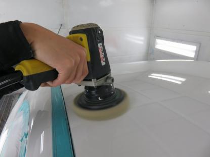 ボディを磨き始めました。坂本オートサービスでは、数種類の磨き方と数種類の材料を使い分けて仕上げるのを基本作業とし、バフ目やオーロラと呼ばれるギラギラの出ない施工方法で研磨しております。