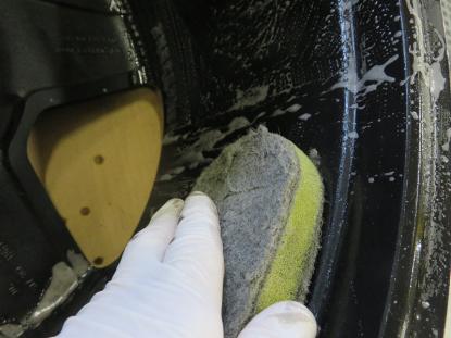 裏面にこびり付いた汚れを洗剤の付いたスコッチブライトで取りながら足付けしていき下地処理が完成します。 |