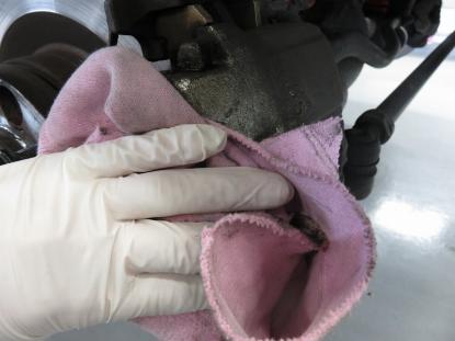 ホイールを取り付ける前にブレーキキャリパー周辺の汚れを掃除します。せっかく綺麗になったホイールなのにちらっと見えるキャリパーが汚いのは残念ですよね!このひと手間を惜しまないのが坂本オート・サービスのこだわりでもあります。 |