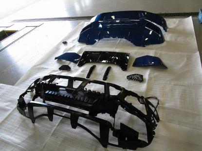 続いてボディ同色でペイントするパーツを台にセットします。リヤバンパーのインナーパーツは外から一部見える所も塗装します。 |
