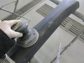 塗装の作業に移ります。表面をダブルアクションサンダーで削ってから、2液型のカラーサフェーサーを吹き付けていきます。 |