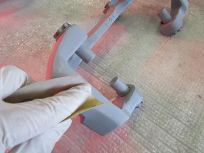 ロゴ入れです。表面をサンディングしてからAMGロゴを貼り付け、その上からクリアーを塗装します。 |