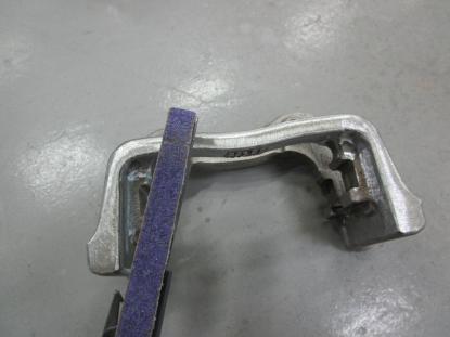 ブレーキキャリパー表面のザラザラをベルトサンダーで削り落としてきます。 |