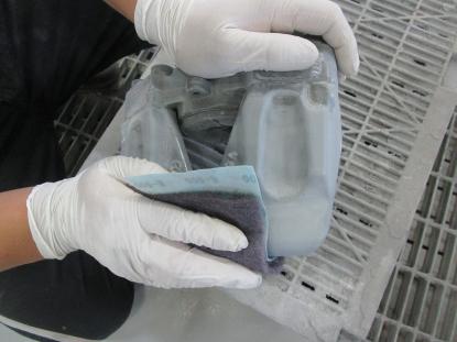 乾燥後、手作業でキャリパーの表面が平滑になるよう仕上げていきます。 |