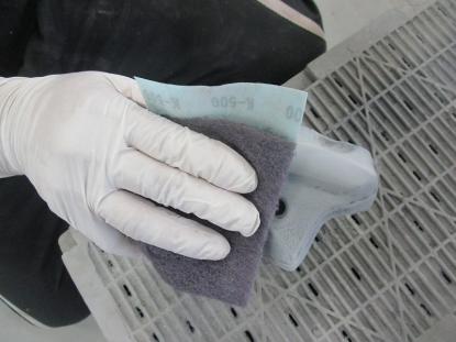 付着した汚れを取り除いてから、密着プライマーを塗り2液型サフェーサーを塗装します。 |