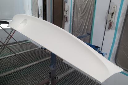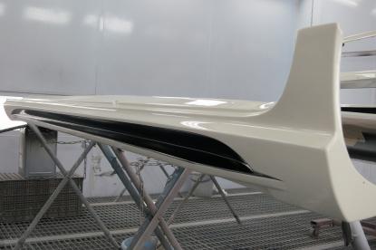 仮組みが終わると、パーツの表面のデコボコをダブルアクションサンダーで削り落とし、小さなキズやFRP特有の巣穴と呼ばれる気泡のようなものをパテ等を使って丹念に1つ残らずなくす作業を行い、二液型のカラーサフェーサーでシールします。 |